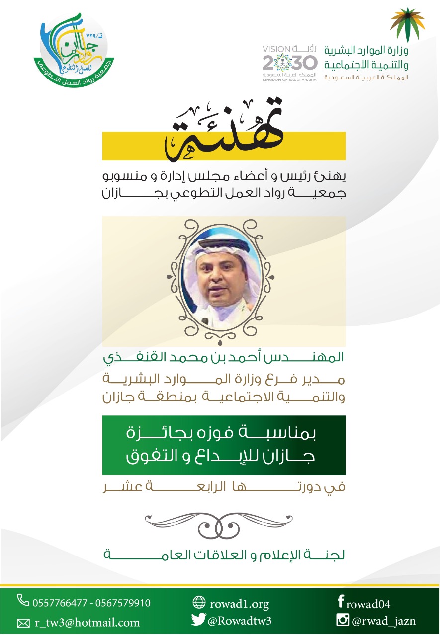 تهنئه رئيس وأعضاء مجلس إداره ومنسوبو جمعية رواد العمل التطوعي بجازان
